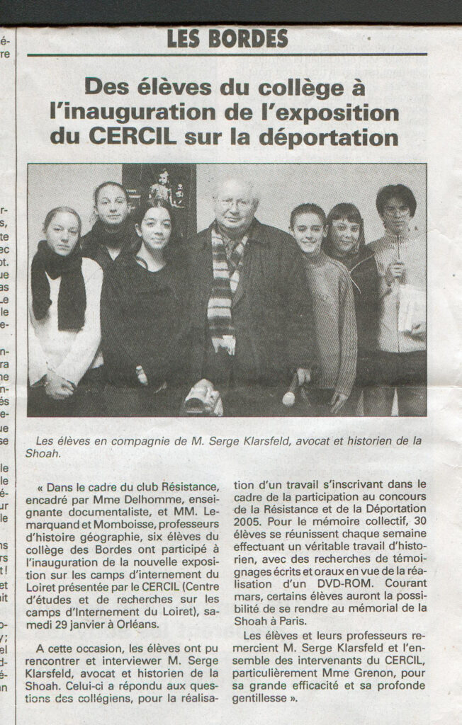 C’est en 2004 que les élèves du collège des Bordes, qui ne s’appelle pas encore collège Geneviève de Gaulle-Anthonioz, découvrent l’histoire des résistances et repressions dans le Loiret. Par l’entremise d’Hélène Mouchard-Zay, une rencontre est organisée au CERCIL, avec Serge Klarsfeld : avocat, historien, Président de l’Association des Fils et Filles de Déportés Juifs de France, membre de la Fondation pour la Mémoire de la Shoah, spécialiste de la question de la déportation des Juifs de France. Pendant plus d’une heure, les élèves pourront poser leurs questions après avoir visité les expositions du CERCIL, une expérience qu’ils n’ont pas oublié, je peux vous l’assurer, une ancienne élève y ayant participé (à la droite de S.Klarsfeld sur la photo) m’ayant sollicité en septembre dernier pour lui transmettre, 22 ans plus tard (!), l’interview filmée ce jour-là !