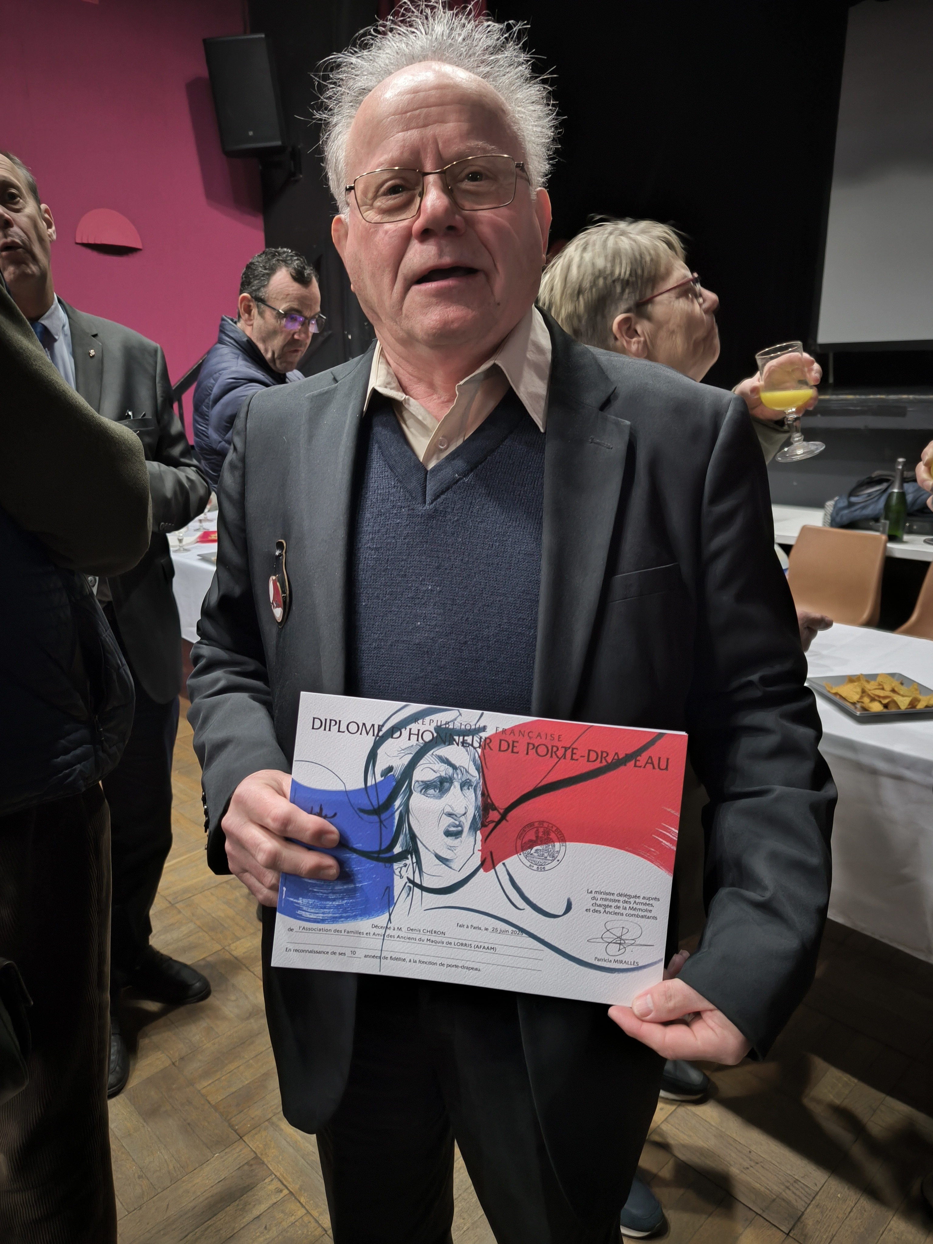 Autre moment fort, la remise par M. Christophe Chaillou, sénateur du Loiret, du diplôme d’honneur de Porte-Drapeau à Denis Chéron, porte-drapeau de l’AFAAM ! Crée en 1961, ce diplôme est aujourd’hui destiné à rendre hommage aux porteurs du drapeau d’associations de citoyenneté combattante (anciens combattants, titulaires de décorations, associations de mémoire, associations sauvegardant le lien entre la Nation et l’armée et d’associations de citoyens bénévoles (pompiers, croix rouge, sauveteurs…). Cette année encore, Denis Chéron a porté haut les couleurs du drapeau du Maquis de Lorris, lors de la Fête du Drapeau pour Le Centenaire du Bleuet de France organisée par la ville de Villemandeur le 21 septembre, comme aux différentes cérémonies mémorielles habituelles du Loiret.
